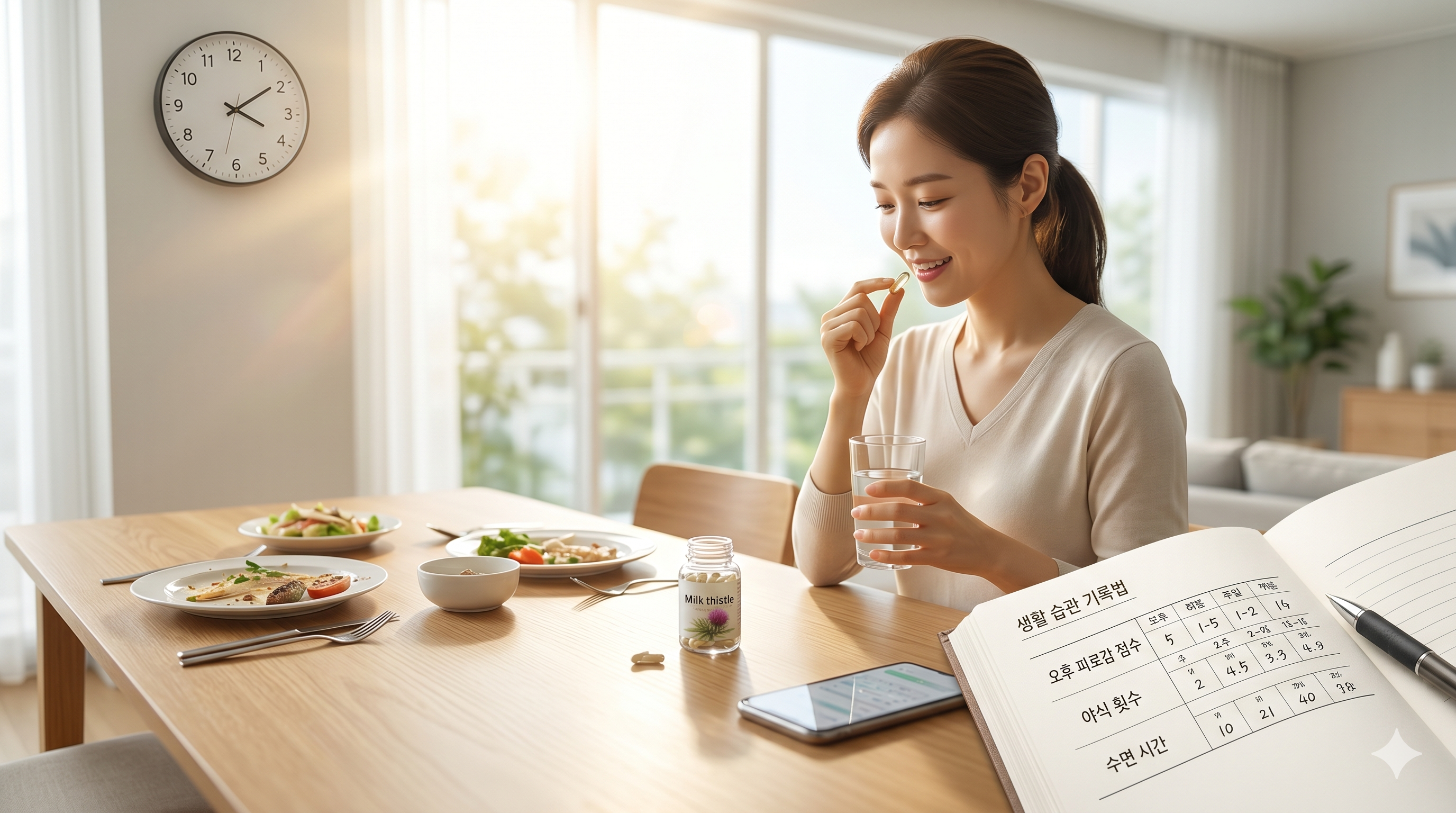 또한, 밀크씨슬 섭취 효과를 객관적으로 확인하려면 2~8주간 '오후 피로감 점수', '야식 횟수', '수면 시간'을 함께 기록해 보며 생활 습관과의 시너지를 체크해야 합니다.