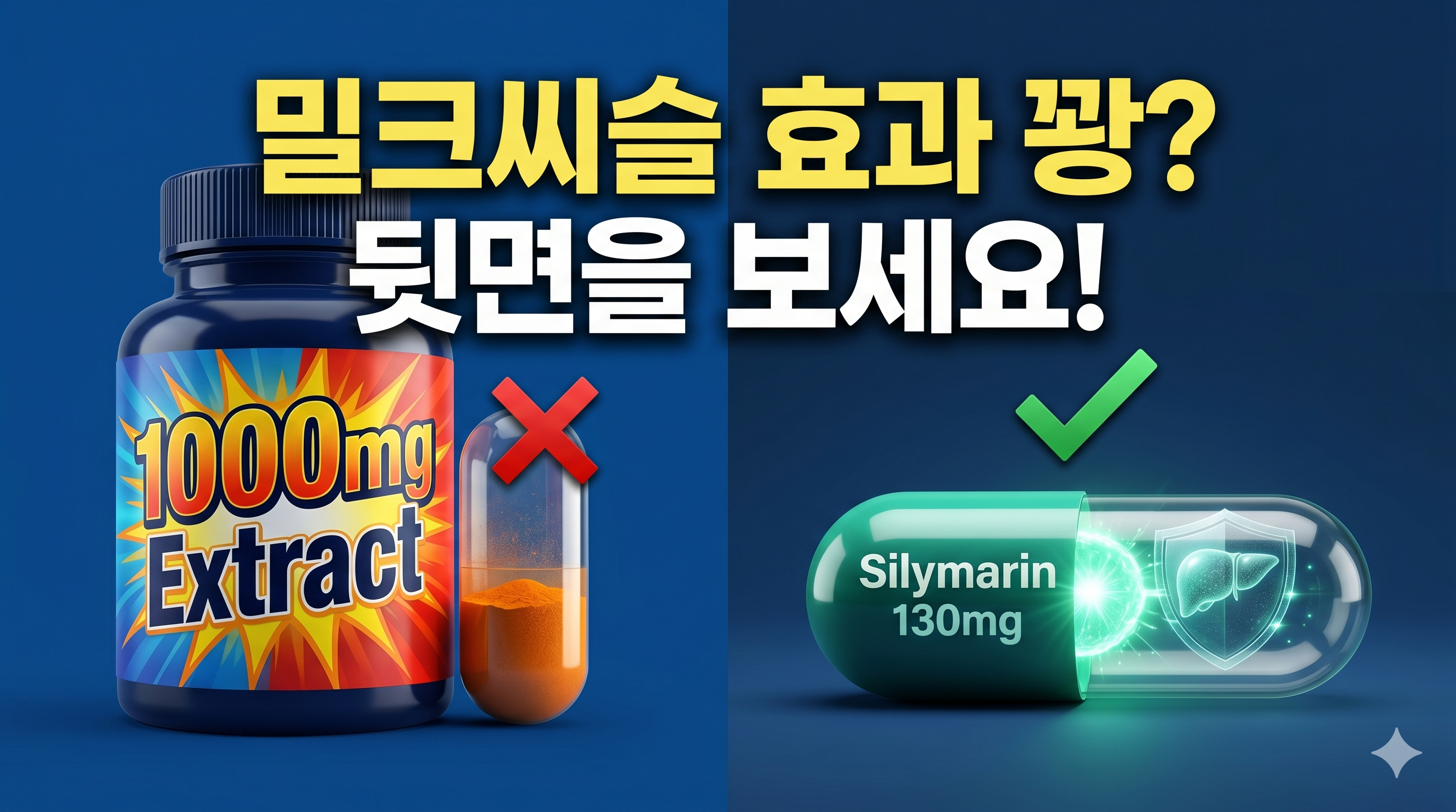 | ① 실리마린 함량 표기 | '밀크씨슬 1000mg' 광고에 속지 마세요. '실리마린으로서 130mg'처럼 활성 성분량이 투명하게 표기된 것이 진짜입니다. |