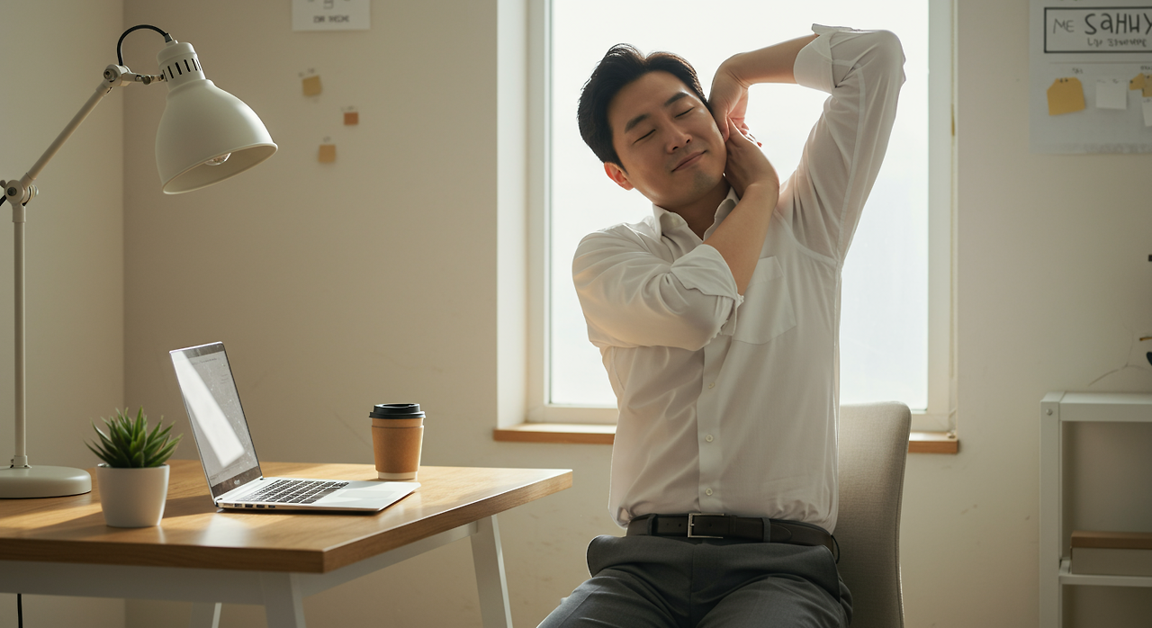 - 틈틈이 스트레칭: 앉아 있는 동안 1시간마다 일어나 목, 어깨, 팔, 다리 등을 가볍게 스트레칭합니다. 발목 돌리기, 까치발 들기 등 간단한 동작도 도움이 됩니다.