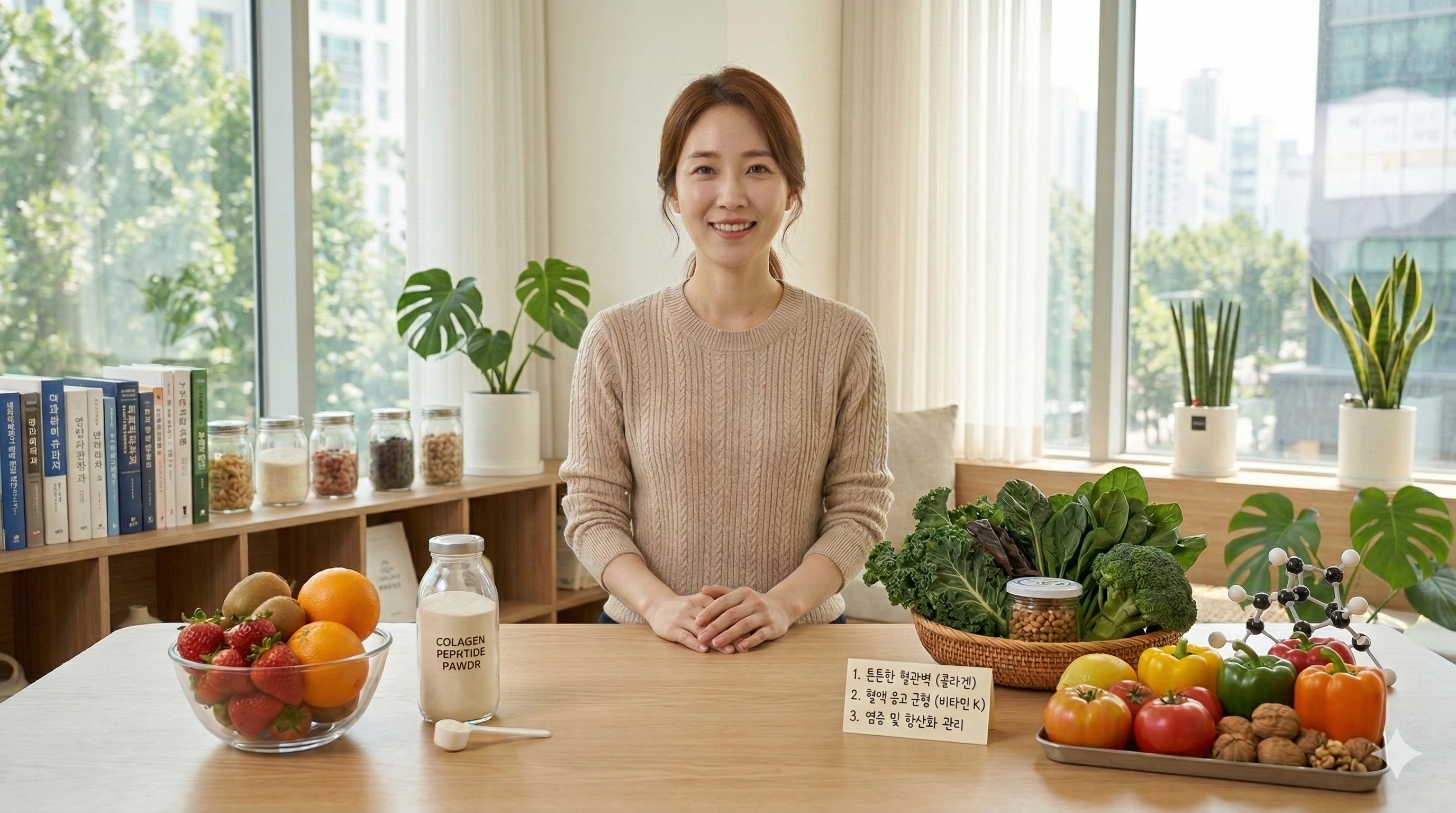 🔹 비타민C & 단백질: 콜라겐은 혈관의 기둥입니다. 재료(단백질)와 공장장(비타민C)을 함께 섭취하세요.