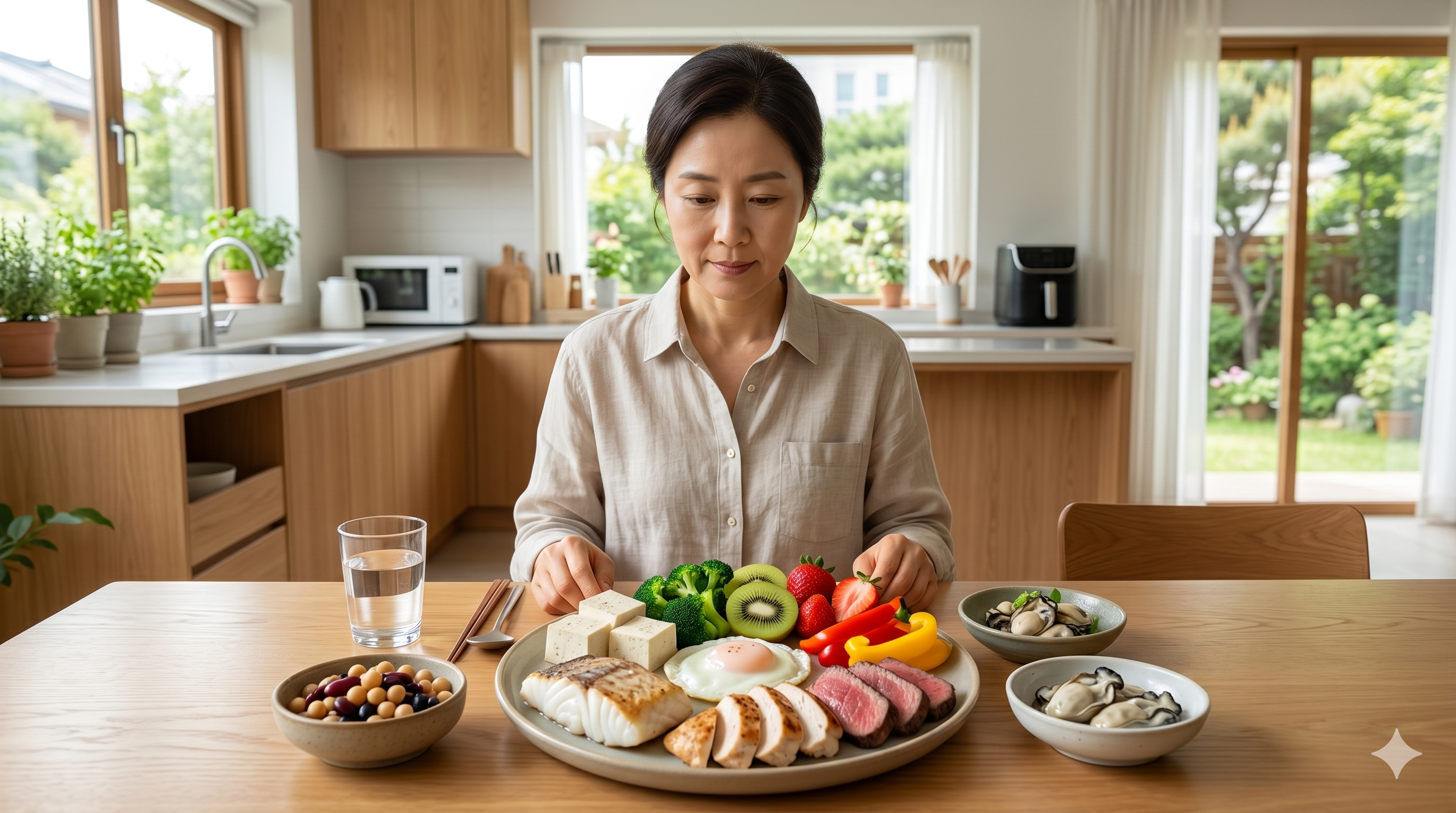 • 양질의 단백질: 소화가 잘되는 달걀, 두부, 흰살생선, 닭가슴살을 매 끼니 나누어 섭취하세요. (흡수율 극대화)