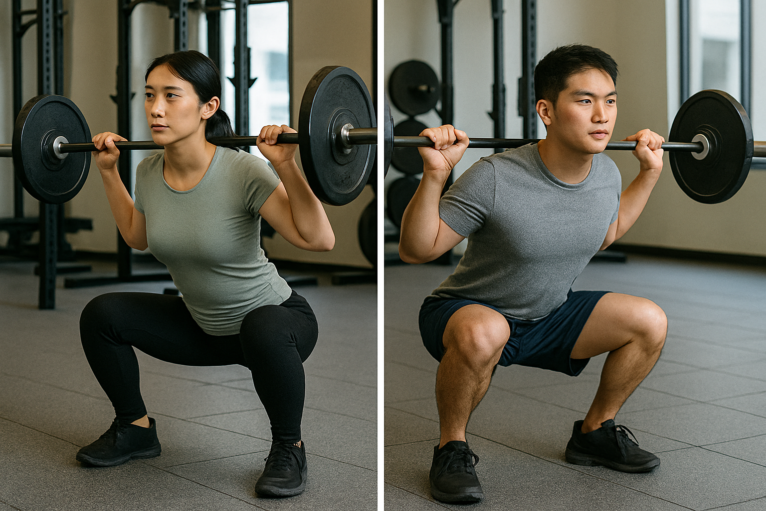 - 시선: 시선은 동작에 따라 자연스럽게 움직이되, 과도하게 숙이거나 들지 않습니다. (예: 스쿼트 시 정면 또는 살짝 아래)