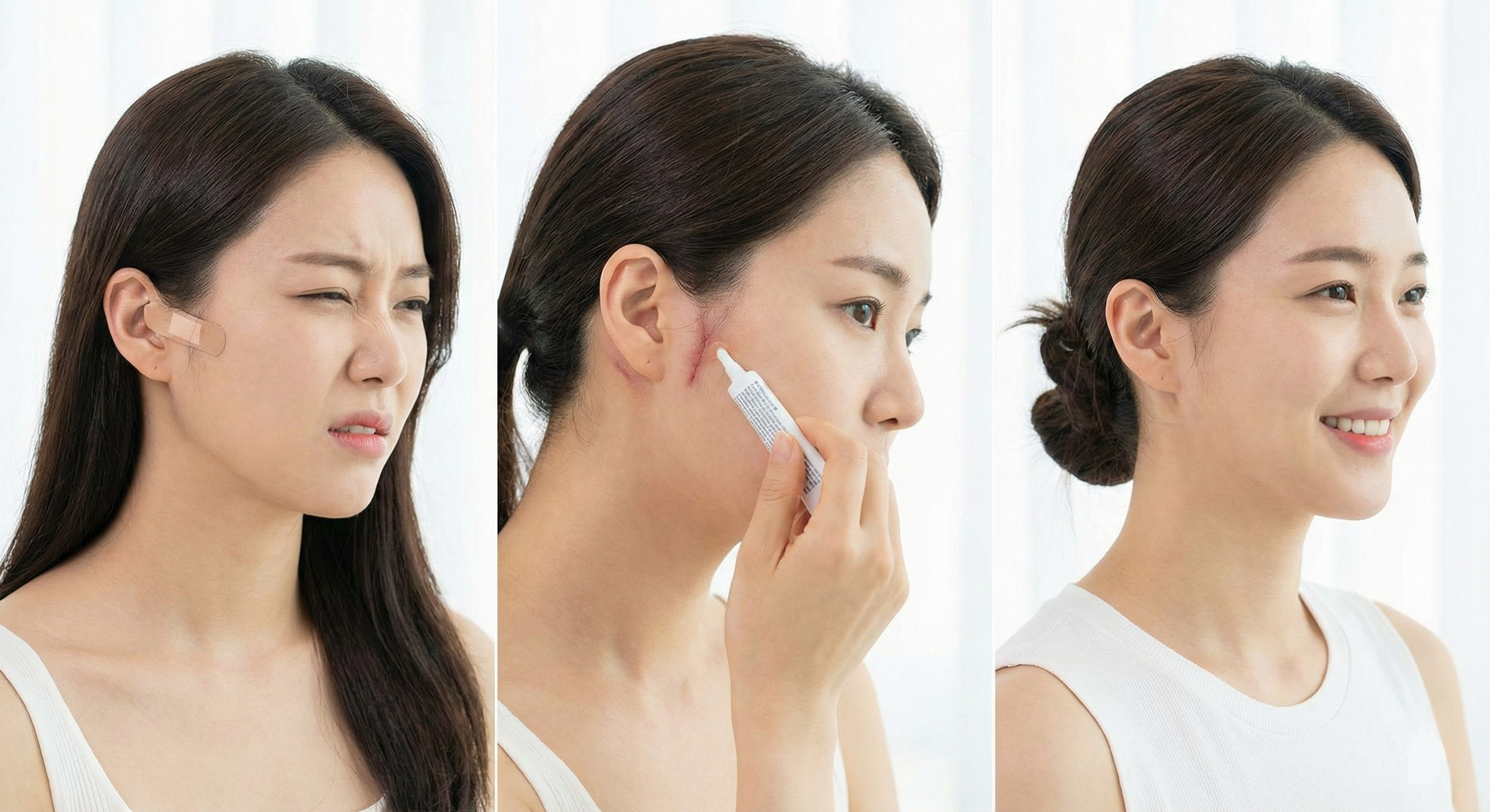 새살은 자외선에 매우 취약합니다. 외출 시 귀를 덮는 모자를 쓰거나 자외선 차단제를 꼼꼼히 바르세요. 이 시기에는 해당 부위를 강하게 마사지하거나 잡아당기는 행동을 삼가야 합니다. 🧴