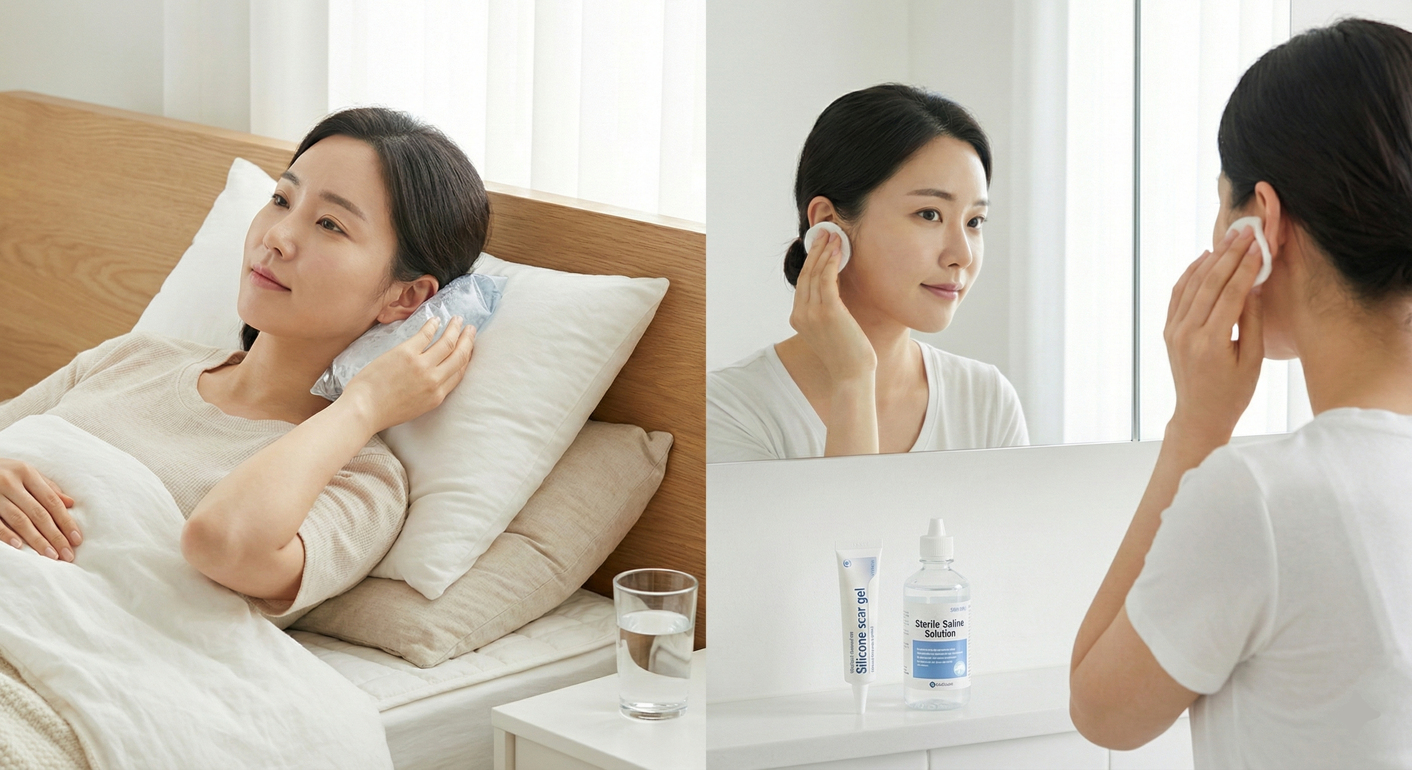 수술 직후 일주일은 '진정'이 핵심입니다. 얼음찜질을 하루 3~4회 가볍게 대주어 혈관을 수축시키고, 주무실 때는 베개를 높게 하여 혈액 쏠림을 방지하세요. 음주와 흡연은 최소 한 달간 반드시 피해야 합니다.