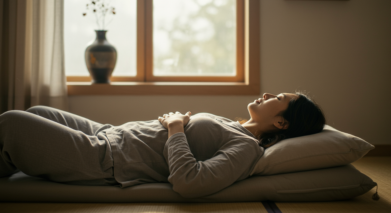 4–6 호흡으로 연습해요: 코 4초 들숨 → 입 6초 날숨. 배가 부풀고 가라앉는 복식 감각에 집중해요(5–10분).