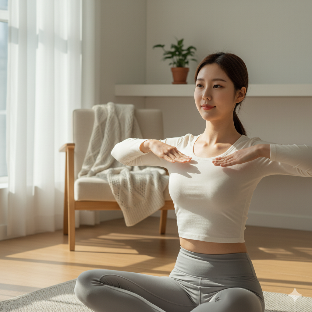 편안히 앉거나 서서, 숨을 들이마시며 팔을 옆으로 크게 벌려 가슴을 열고, 내쉬며 팔을 모아줍니다. 호흡 리듬을 정돈합니다. |