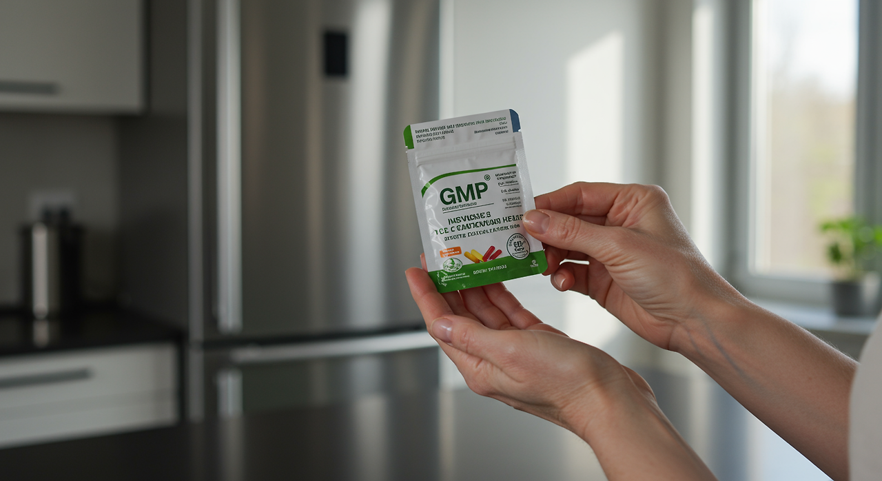 제품 라벨의 '건강기능식품' 마크와 GMP 인증을 확인하세요.